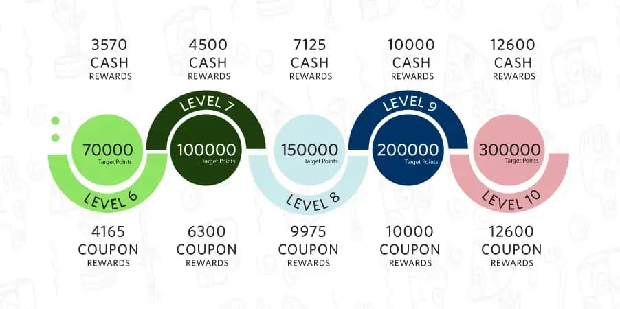 - Once you reach the highest rewards level that is level 10, further every 50,000 points you will be getting benefits of 10,000 Cash rewards and 10,000 Coupon Rewards.